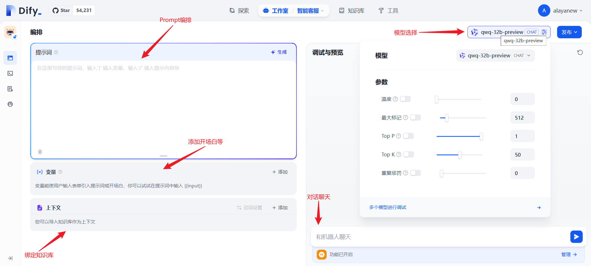 应用创建完成,可以进行Prompt编排、添加开场白、绑定知识库、模型选择以及对话聊天。