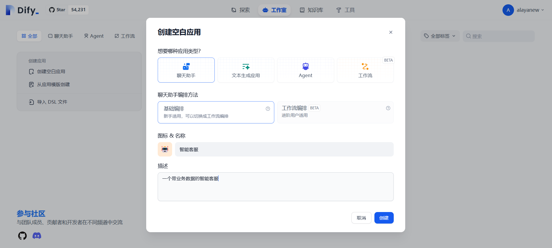 Dify启动后,可以在【工作室】中,选择【创建空白应用】,基于使用场景选择【应用类型】以及【编排方法】,填写应用的【名称】与【描述】,即可完成基础应用的【创建】。