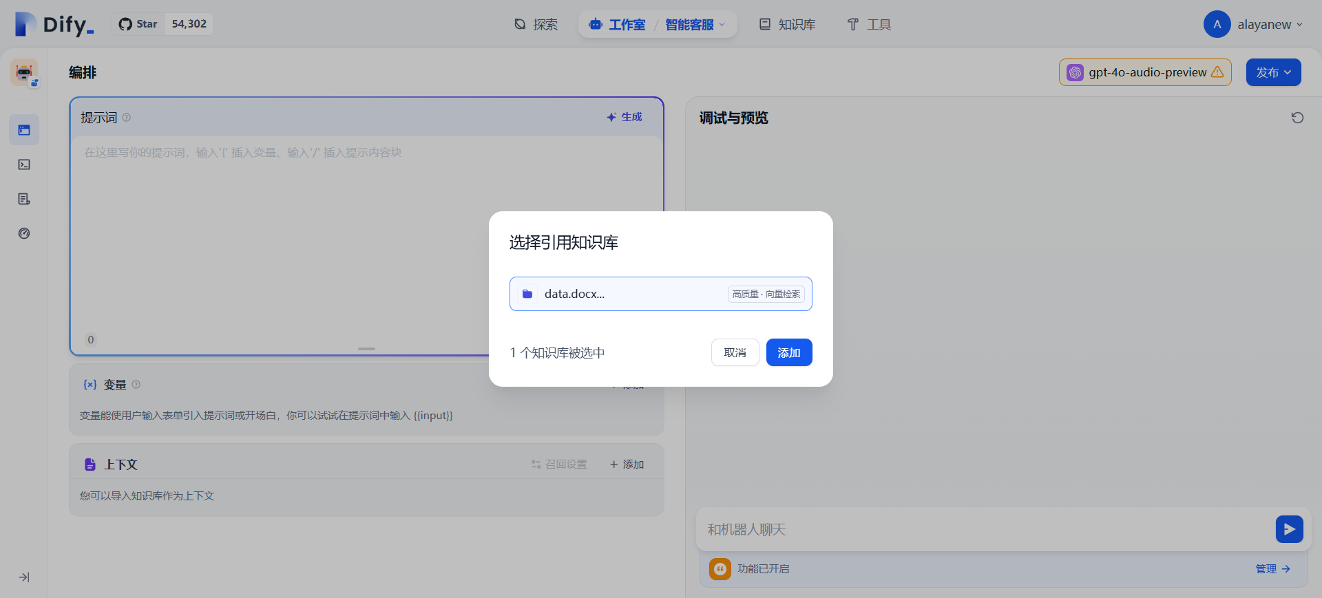 我们回到创建的应用,在上下文处【添加】,【选择】创建好的业务数据相关的知识库,【添加】后即可完成知识库的绑定。