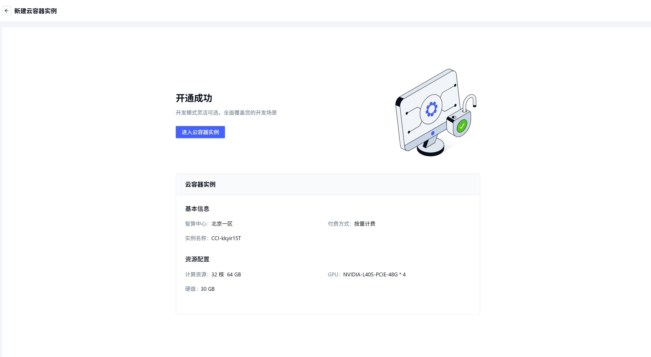 完成后点击立即开通, 提示CCI开通成功,点击进入云容器实例列表页查看详情信息。