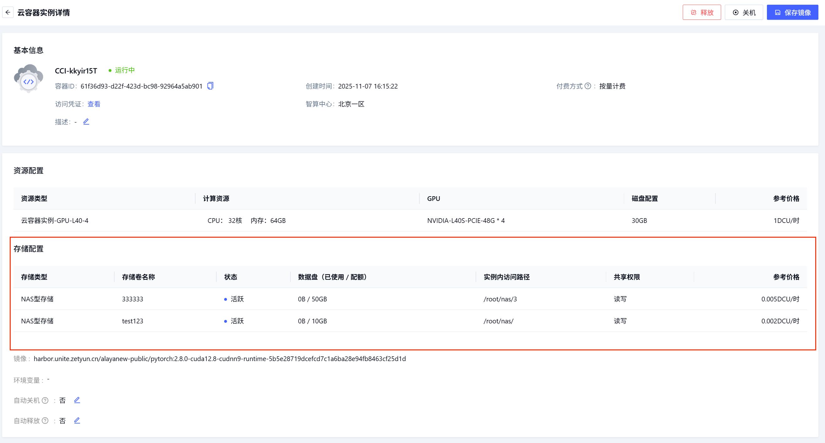 - 主账户已开通存储,可在CCI开通页面的存储配置一栏选择已开通的存储,具体可参考开通NAS型存储。