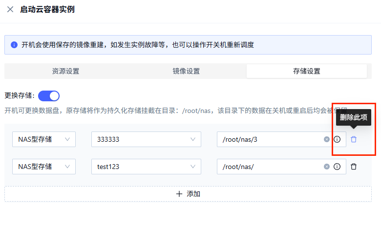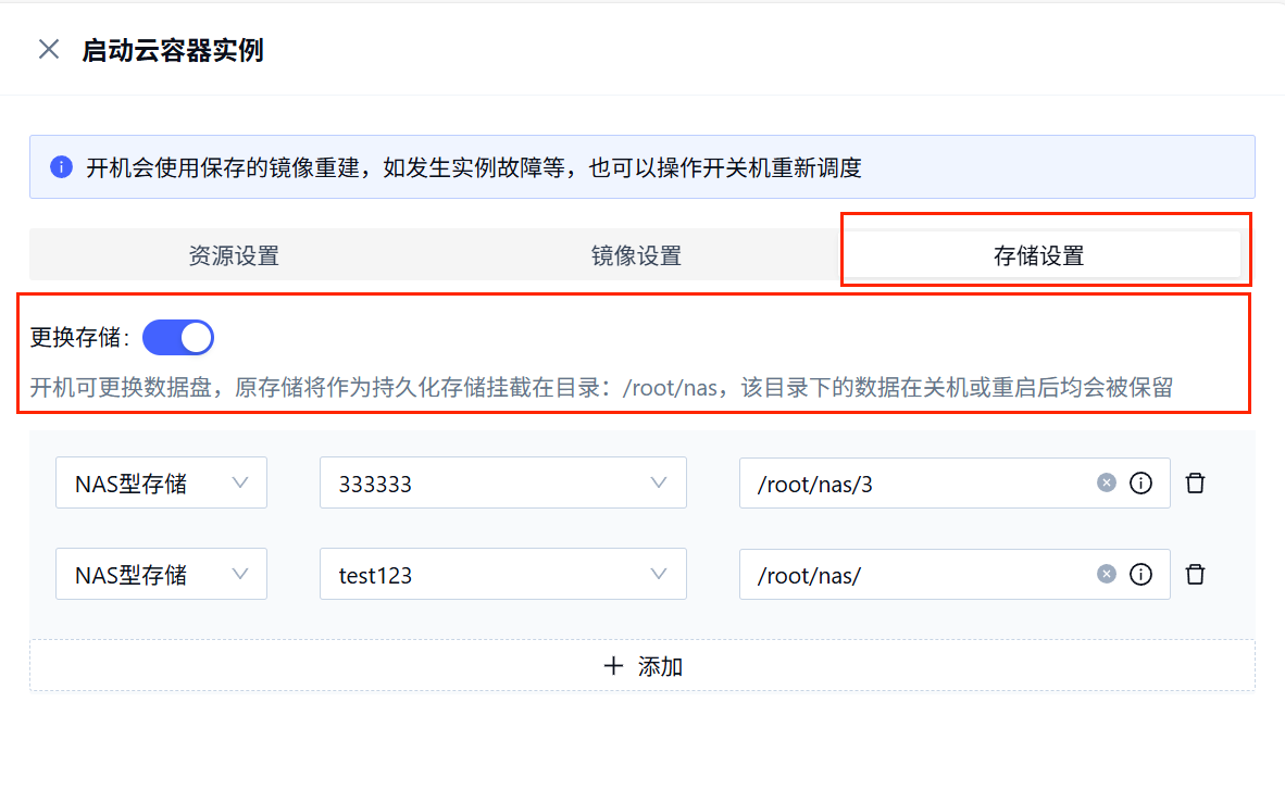 单击“新建云容器”,进入[云容器实例]开通页面,在开通页面的存储配置区域,点击添加可同时挂载多个已开通的存储卷,开通云容器实例的更多参数配置,可参考开通云容器实例。