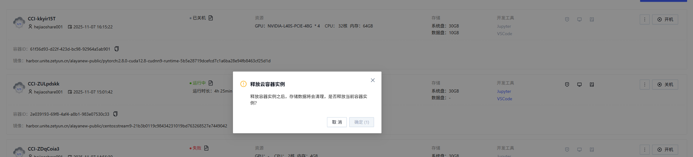 在弹出的提示框中单击“确定”,即可释放存储实例。