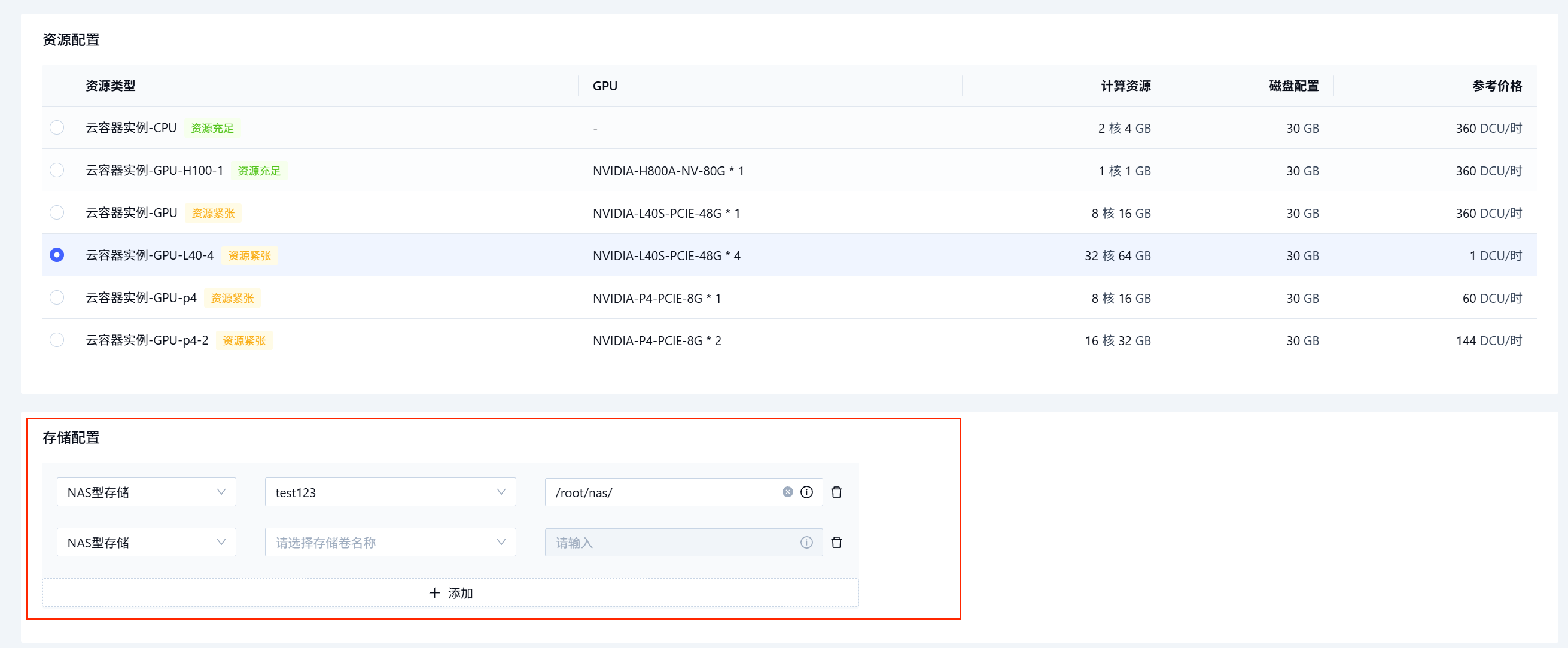 - 主账户已开通存储,可在CCI开通页面的存储配置一栏选择已开通的存储,具体可参考开通NAS型存储。