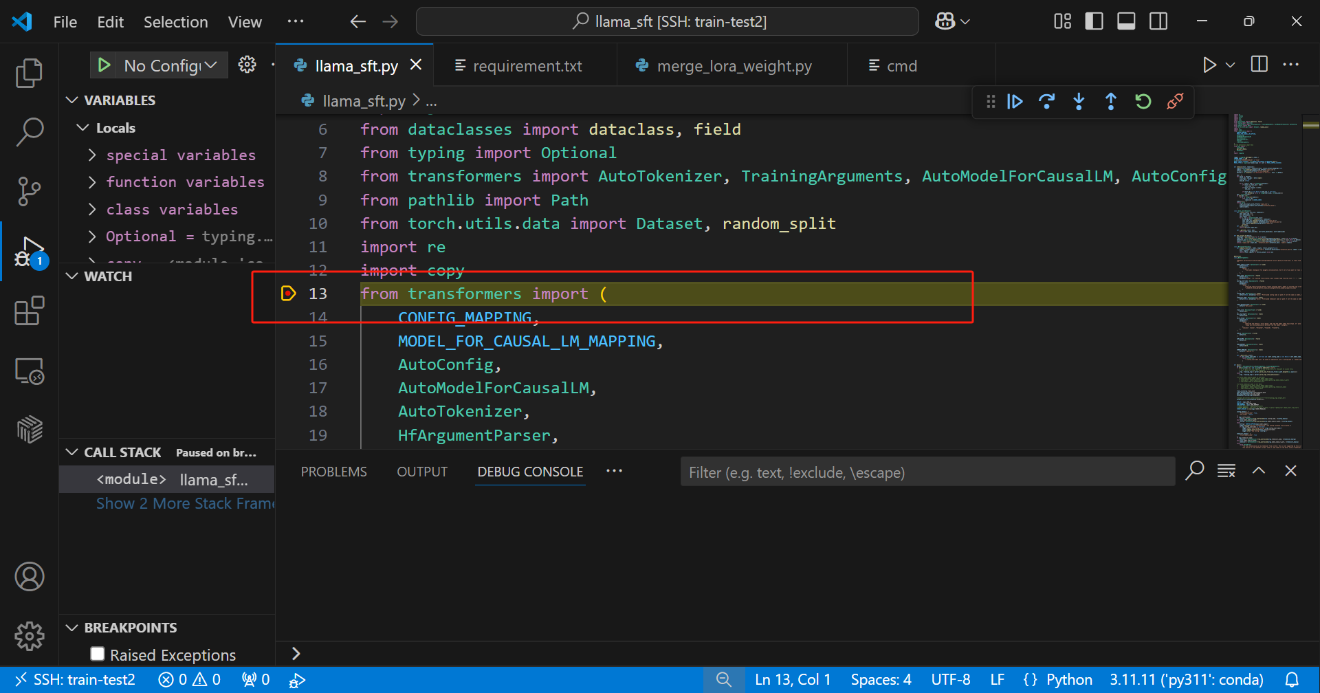 在DEBUG COMSOLE中可以看到调试的日志,断点调试等