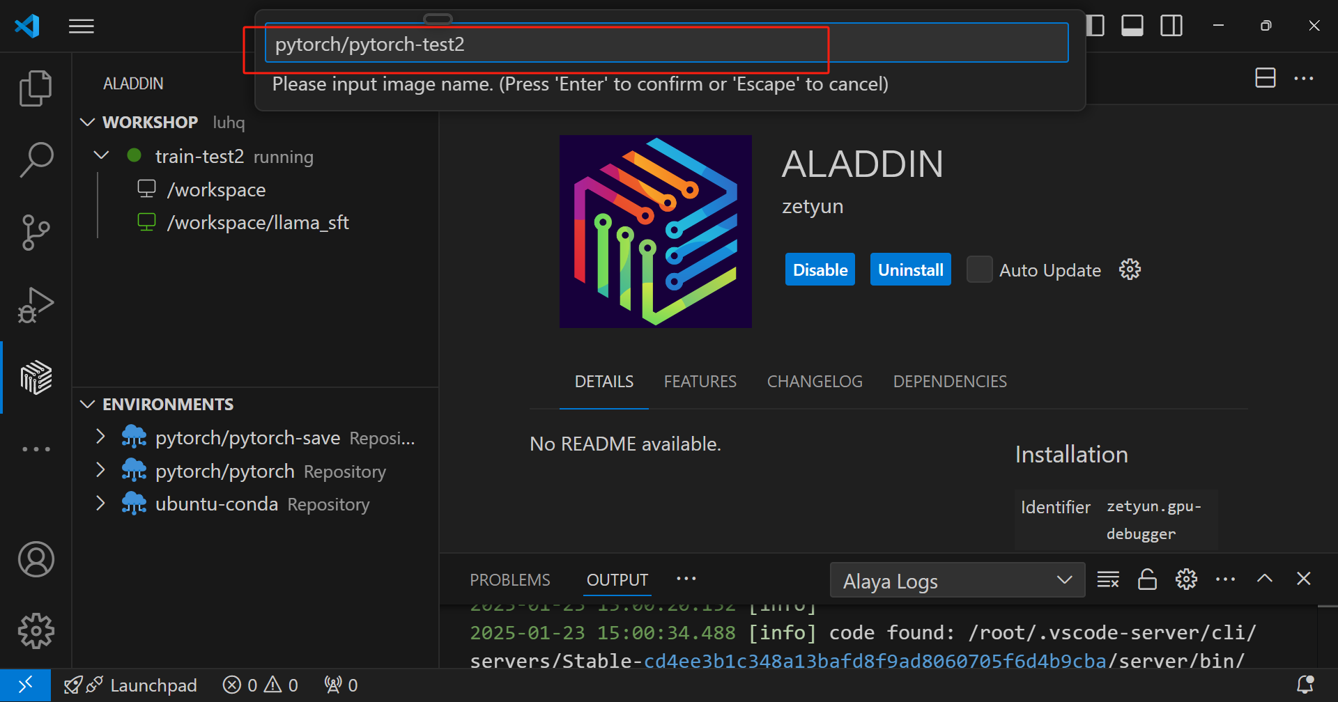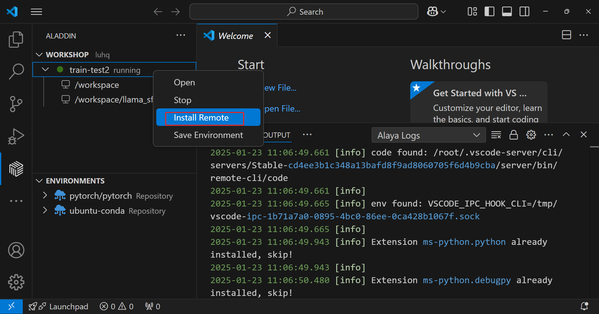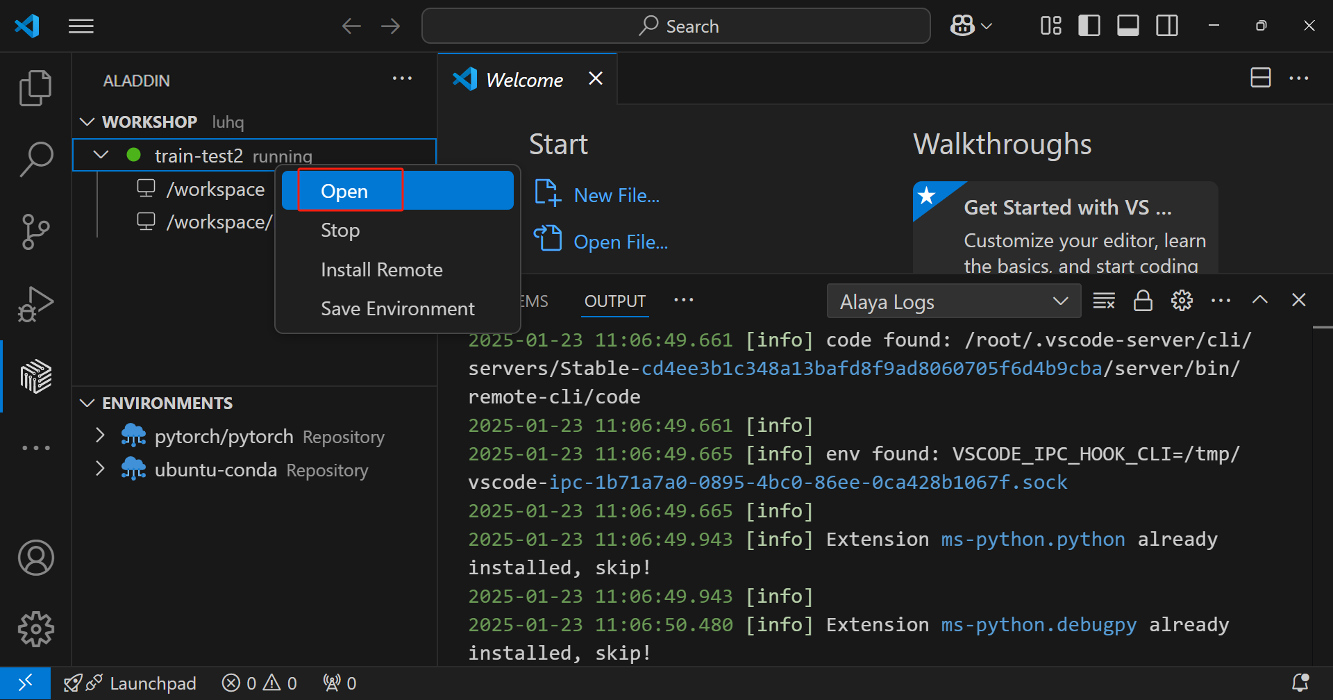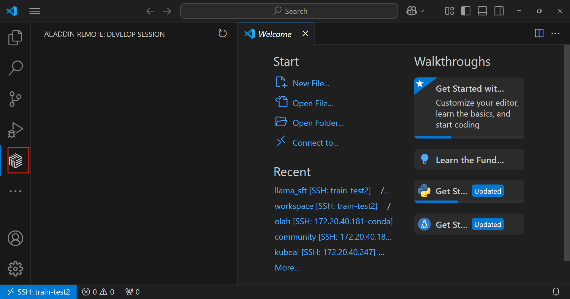 接下来会自动打开一个新的vscode窗口,连接进入到workshop中,并下载vscode相关插件,等待插件安装完成,会看到aladdin的图标
