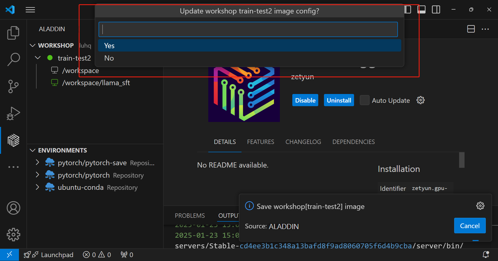 镜像保存成功后会提示是否需要使用保存的镜像替换当前workshop,如果需要点击yes,不需要no即可