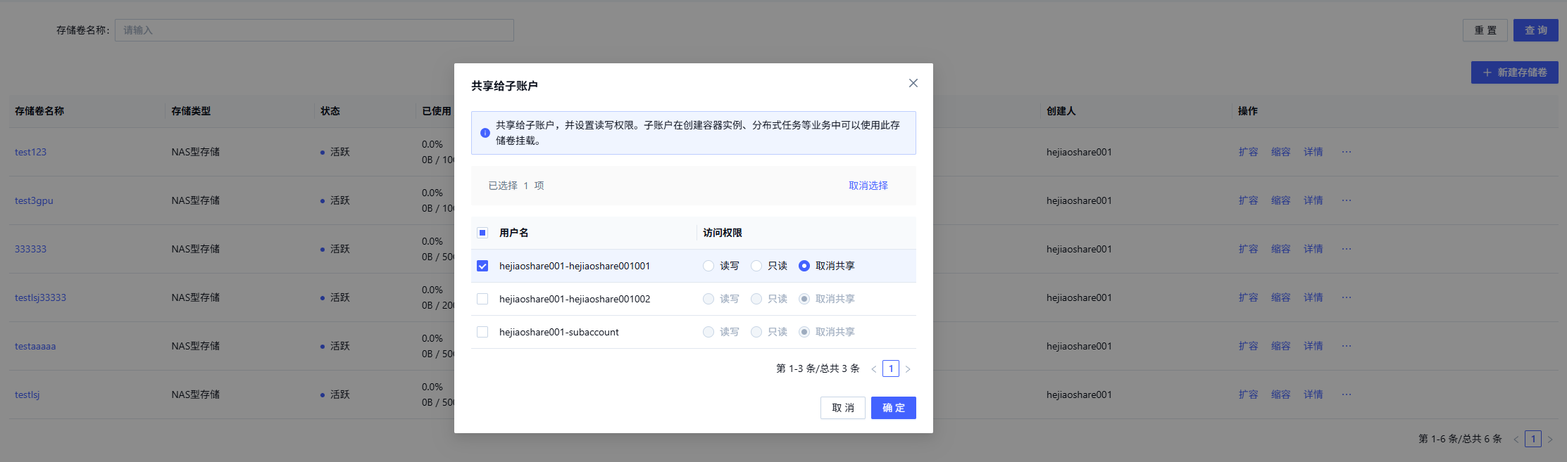 管理员-主账号: 支持开通、查看、修改、删除企业内所有用户的存储卷,以及对存储卷进行扩容、缩容操作。支持管理子账户存储访问权限,修改存储卷共享详见下文的修改共享权限内容。