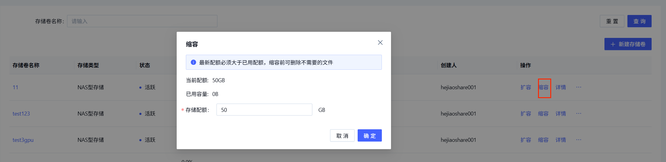 点击缩容,输入缩容后的存储配额数,缩容后总配额范围在已使用配额 - 当前配额之间, 点击确定**提交。