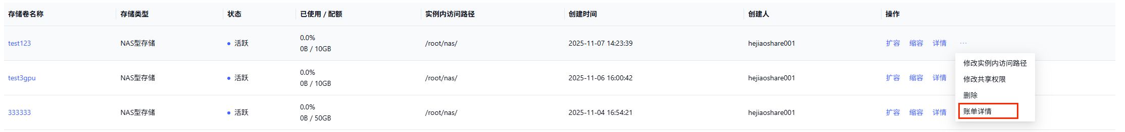在存储列表页右上方点击账单详情,页面跳转到账单明细页。